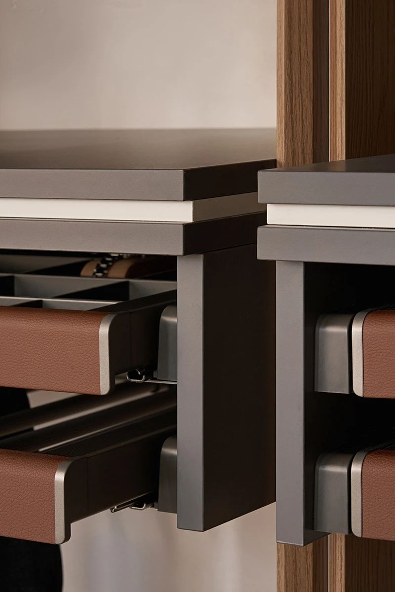 我们采用门墙柜一体化+毫厘级品控+无孔设计,门板导角弧度精确到1毫米,经过上百次的打磨0毛刺0瑕疵*,极简层板托与银色铰链构成蒙德里安式几何美学,兼顾美学与功能。
